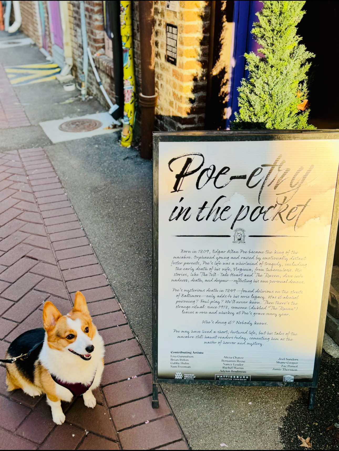On a brick-lined alley, next to Daisy, a corgi with more charm than Poe’s raven, I stumbled across this sign: ‘Poe-etry in the pocket.’ It struck me that literature is never just confined to books or screens. It leaks into alleys, into conversations, into the static hum of daily life. We write, we post, we scroll, and in doing so, we prove that words never truly die. They just change costumes, waiting for us to stumble across them again, in some liminal pocket of the world.